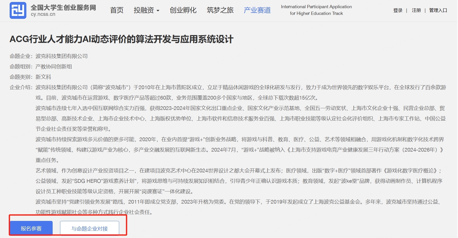 1. 登录“全国大学生创业服务网”,点击首页“产业赛道”栏目,搜索“波克科技”;2. 选中“波克科技”所属命题,点击左下角“报名参赛”和“与命题企业对接”,即可报名。